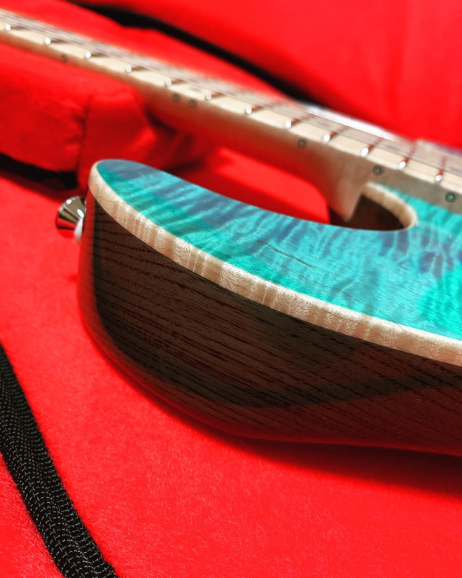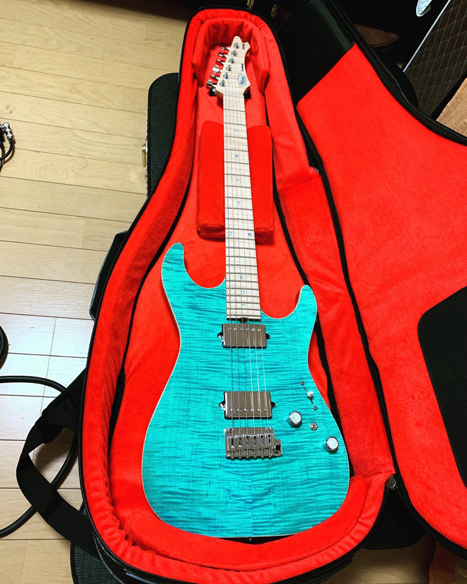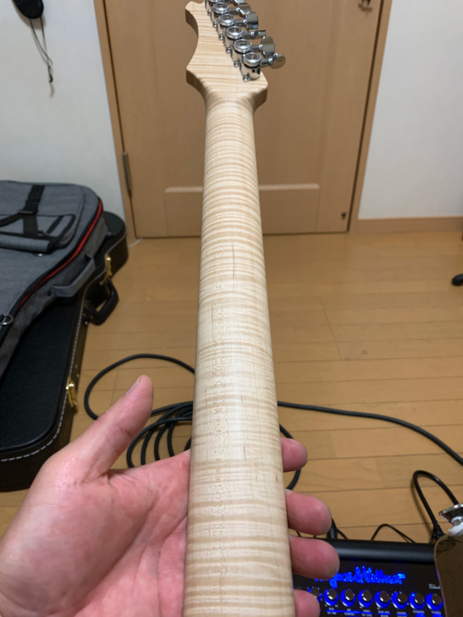 kino factoryさんのTwitterで、塗装途中のボディの写真を見た瞬間に《コレだ!》と思い、DMで「ネックと指板はフレイムメイプルですか?」と、ほぼ押し付けるように確認しましたw