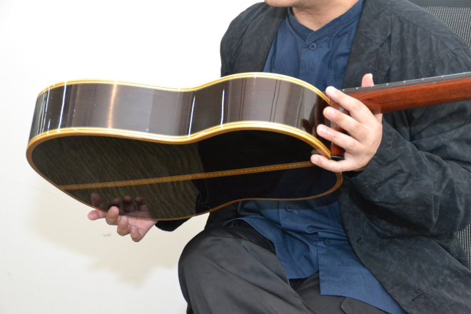 鈴木:トップはスプルース。松です。サイドとバックはハカランダ。ブラジリアンローズウッドと言われるものです。普通のローズウッドよりは少し色が濃くて、今はこれはもう新たに切ってはいけないヤツ(笑)。これを作った2000年の時点では、もうこういう良い木はなかったはずなので、大変な材料を使ったギターですよ(笑)。