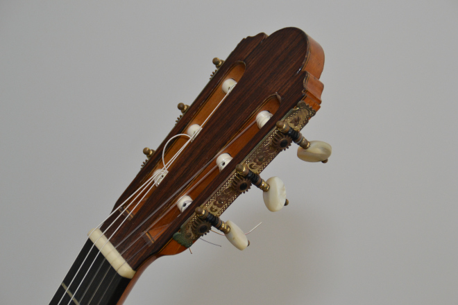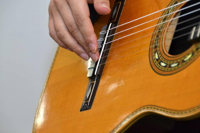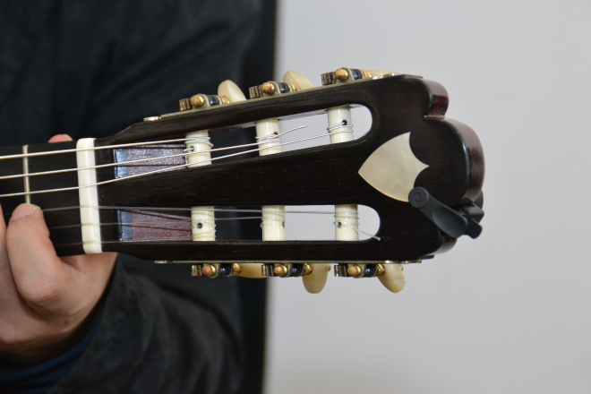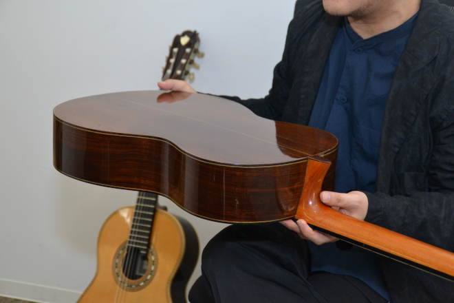 鈴木:実はこれ、知らないうちにどこかにぶつけたらしく、ヘッドのところが一度もげたことがあります。そこはニカワで留めているんですが、ニカワって50年くらいすると外れることがあるらしいんです。だから、古いギターって残っていないんですよ。バイオリンはボディを彫りこんでいるけど、ギターは曲げて貼り付けているから、バラバラに外れちゃったりするんです。