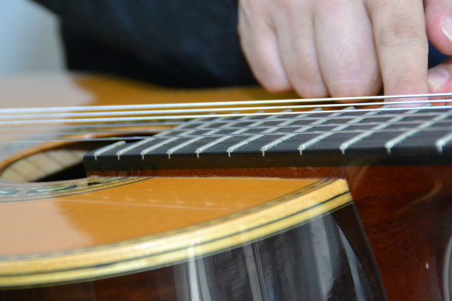 鈴木:スプルースもそうですけど、サイドとバックに使ったハカランダという木は重くて強い木なので、振動してくるまでに年月がかかるんです。実は今井さんにはこのギターの後同じタイプで3本、合計4本作っていただいているんですが、この1号機はずっとしまってあって、ときどき友達が借りて弾いてくれたりしていたんです。そして20年経った今、来ました!って感じですね(笑)。フレットをエレキ用で有名なジェスカーに替えたのもあって、今もう絶好調です。やっと旬が来たというところです。