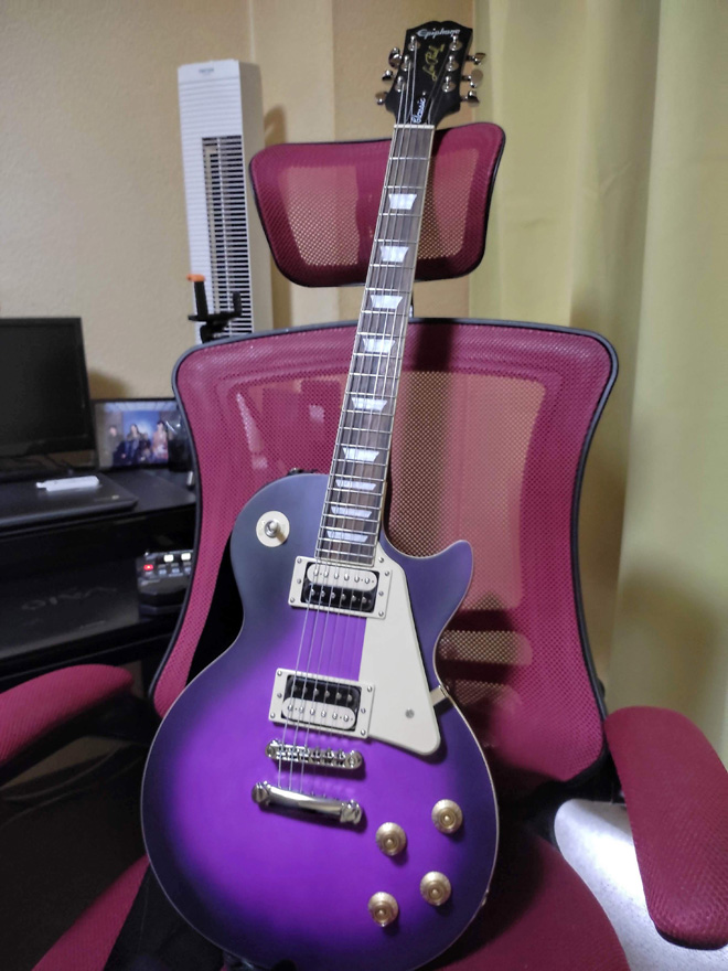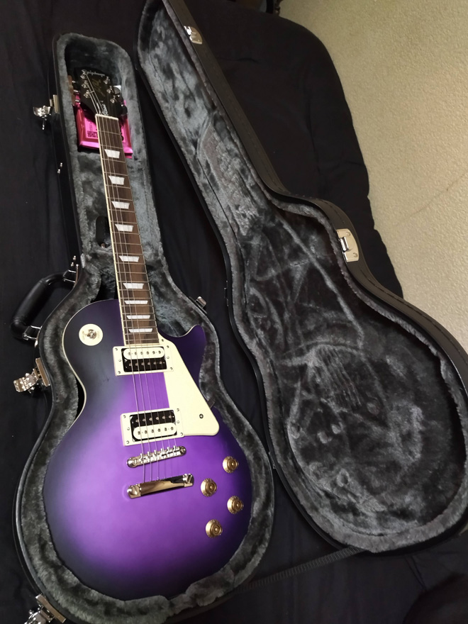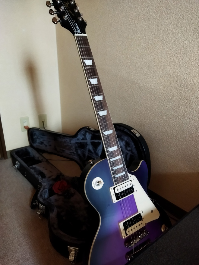 いざ現物が届いてみればバンド時代にGibsonのレスポールスタンダード、カスタムと使い続けて来た私でも納得のスペックで、皮肉にも70年代後半物と80年代中期物だった2台のGibsonより明らかに造りが良く満足したものの、ハードケースが別売りだったのでヤフオクで予備も含めて2台買い込み「紫の君」と名付けて自宅闘病の友として弾き込み、写真を撮ってはうっとり眺める毎日。仙台は今年に入り地震が多いのでスタンドの後ろに開けたケースをセットして夜はケースに仕舞い込んで寝る過保護。