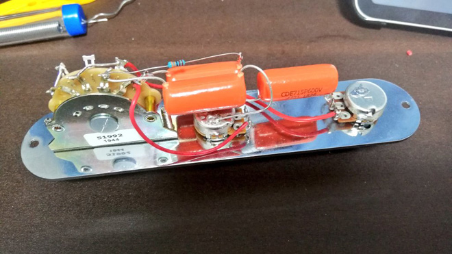エスクワイヤの特徴と言えば、セレクターを用いたトーンコントロール。ネック側に倒すとトーン100%、センターはポッドを用いた任意のトーン、そしてブリッジ側はトーン0%(バイパス)と、言わば「仮想ピックアップ」のような役割を果たしてくれます。そのため通常であれば1つで済むコンデンサも3つ必要になるのですが、それによる「ごちゃごちゃ感」もこれまた独特の格好良さがあります。