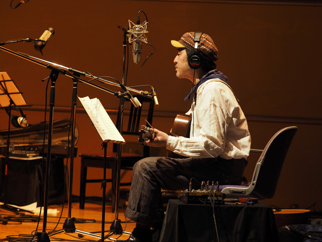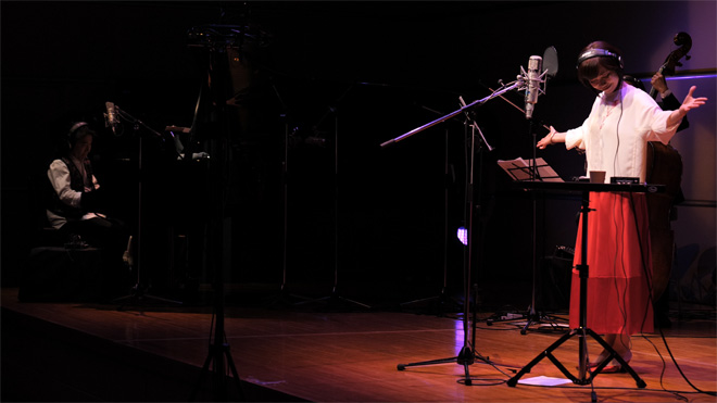 藤田恵美:そうです。そういう意味でのエンターテイメントとしてとらえるとズレると思うんです。今回は、ただ「ステージがそのままレコーディングスタジオに」「レコーディングスタジオがそのままステージになった」っていう映像なわけです。普段だと、各楽器を隔てるようにそれぞれ部屋に入って、お互いの音を遮断したところで演るのがレコーディングスタジオなんですけど、今回はみんなが同じステージにいてパーテーションもない状態。そこでみんなヘッドホンをして、私も真ん中にレコーディング用のマイクがあって、そこに立ったままそこから動けないわけですよね。鎖に繋がれた犬みたいな感じですよ(笑)。ステージの真ん中にずっといる映像ですから、映像としてだけ捉えたら、コンサート版とかライブ版というおもしろさはないと思うんですよね。