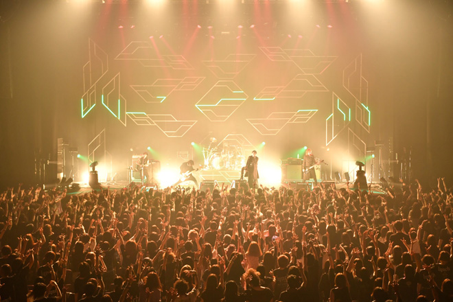 序盤はアッパーな楽曲たちが息継ぐ暇もなく押し寄せ、暴力的なまでの葉月(Vo)のシャウトが会場をヒートアップさせていく。ステージにちりばめられた「ULTIMA」をイメージした近未来的なライトセットが5人とファンをつなぎ、輝かせる。
