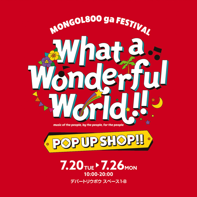 MONGOL800が主催する音楽フェスティバル<What a Wonderful World!!>のポップアップショップが、7月20日から沖縄・デパートリウボウで開催される。