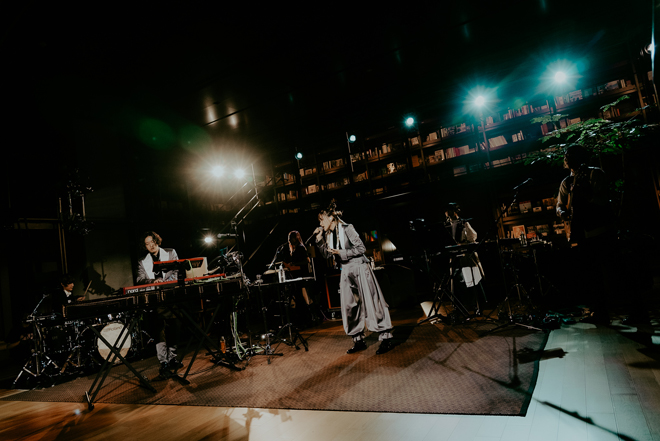 19時、ライブはドローンのカメラが瀟洒なエントランスを抜けていく様子からスタート。『YOASOBI UT』があしらわれたモニュメントの先には<UT×YOASOBI『SING YOUR WORLD』>の大きなロゴがあり、そして四方を書棚に囲まれたスペースに現れたのは、前回のライブ同様4人のバンドメンバーを従えたAyaseとikuraだ。前日の夜にミュージックビデオがプレミア公開され4万人を超える同時視聴者が集まったahamo CMソングでもある最新曲「三原色」からパフォーマンスがスタートした。