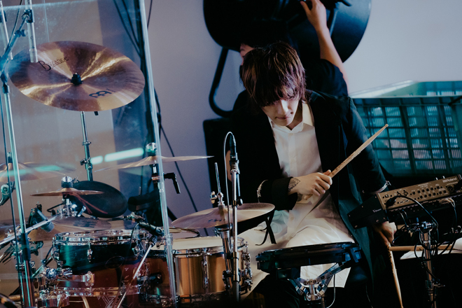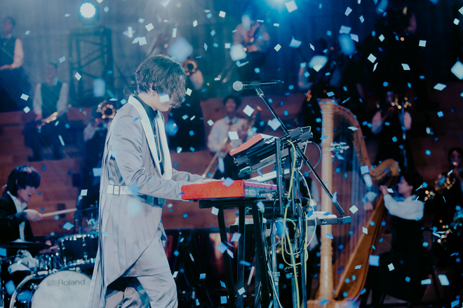 また生配信ライブらしく、コメントを通して視聴者とコミュニケーションを撮る場面もみられた。鬼気迫るパフォーマンスから一点、二人の親しみやすい人柄がよく出た一幕だった。管楽器が印象的なSEに導かれるように大きなホールにステージを移して披露されたのは「ハルカ」。YOASOBIバンドの周囲を取り囲む総勢172名に及ぶ楽器隊は、大阪桐蔭高校の吹奏楽部だ。コロナ禍において活動制限が余儀なくされる中で、YouTubeにYOASOBIのカバー動画をアップしていたことから実現したコラボレーションである。ソーシャルディスタンスに配慮した距離感、フェイスシールド着用という環境下でも、一夜限りのコラボを目一杯楽しもうとする姿勢が学生たちひとりひとりの表情から見てとれた。<SING YOUR WORLD>というライブタイトルの通り、そんな学生たちも高らかに声を響かせた「群青」で、圧巻のライブパフォーマンスは幕を閉じた。