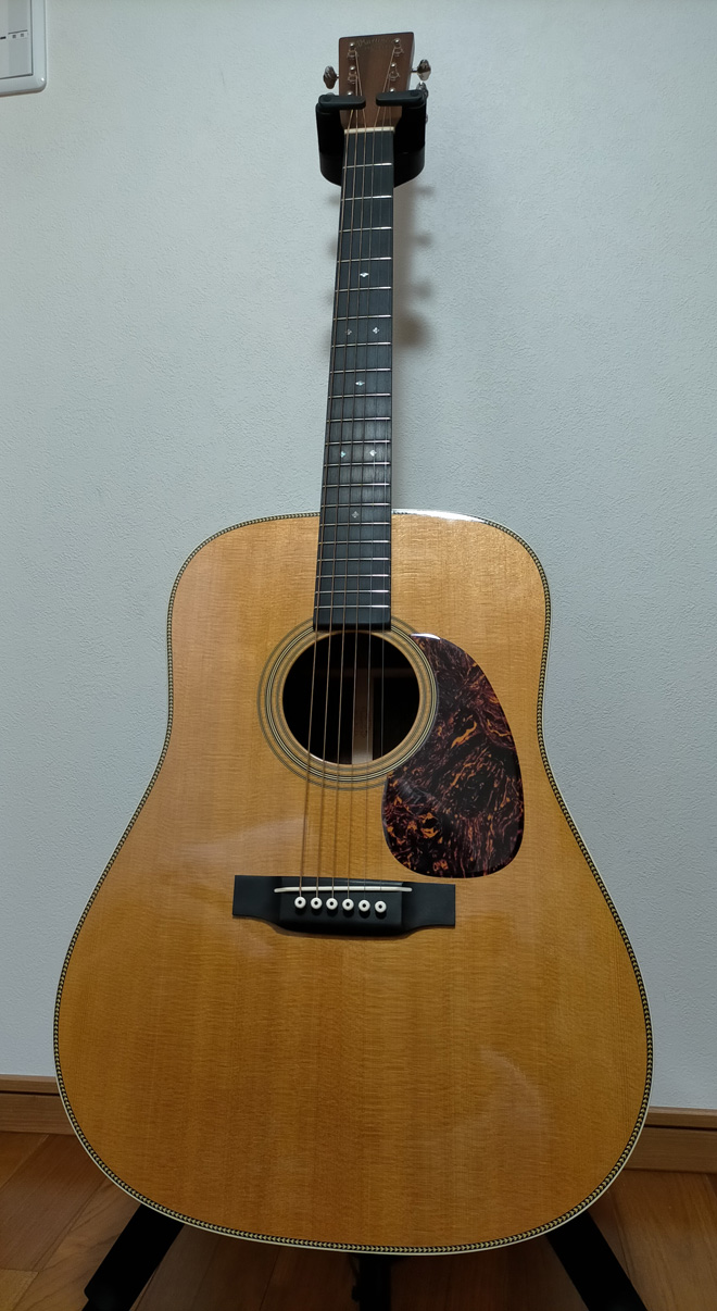 そんななか、出会ったのがこのHD-28Vでした。何の気なしに、楽器店で試奏。欲しい。欲しいよー。気づけばヨダレが…ってことで、やっちまいました(笑)この春、車検を迎えていた車を売っぱらって、そのお金で状態の良い中古品を購入!!妻には「向こう10年ギターを買わない」と結婚式以来の誓いも立てました。