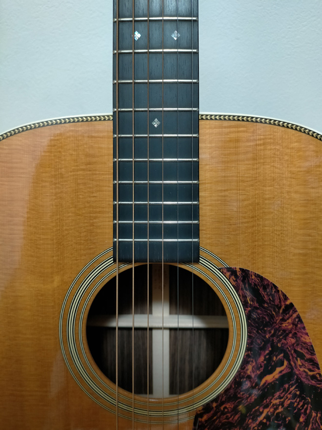 D-28は王道スタンダードですが、HD-28VはそのD-28の原点ですから、ここから始まりここに終わる的な逸品ですよね。私も大好きです。なんせスマートでシャープなヘッドがかっこいい(近年D-28もこうなったけど)し、何よりもロングサドルのルックスが最高っしょ。ピックガードも俄然べっ甲のほうがいいよなー。私も一時期マーティンにドハマリした時期があったんですが、ロングサドルじゃないと欲しくないという偏執的な呪いにかかっておりました。1950年代以前のO-15とかO-17も、んもう最高っすよ。(JMN統括編集長 烏丸)