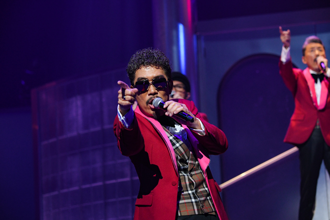 桑野信義を迎えて最初に披露した楽曲は、「Ultra Chu Chu Medley」。この曲は、桑野が在籍していたシャネルズのシングル曲「ハリケーン」「街角トワイライト」「憧れのスレンダー・ガール」「週末ダイナマイト」を再構成したメドレー楽曲だ。この粋な選曲でのパフォーマンスは、今ツアーすべてに帯同している、こちらもシャネルズ/ラッツ&スターのオリジナルメンバーである佐藤善雄と共に披露という、さながらグループの再結成を思わせる演出には、会場のファン達の熱狂的な盛り上がりと共に、多くの涙にも包まれた感動的な瞬間となっていた。その後、「め組のひと」「ランナウェイ」「夢で逢えたら」と、シャネルズ/ラッツ&スター時代の代表曲を共に披露。最後は鈴木と桑野は肩を寄せるように共にステージを後にし、この日最大の拍手喝采の中、本編が終了した。