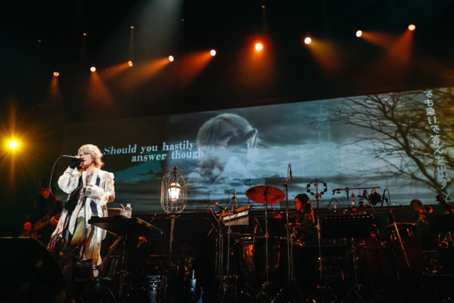 原曲にもオーケストラが参加し、ロンドンでレコーディングされたアルバムだが、リリース当時にツアーは開催されなかった『ROENTGEN』。その世界観の全貌を今回のツアーで初めて生で体感できること、『ROENTGEN 2』を制作する構想のもと、いくつかの新曲を披露する予定であることは事前に把握していたが、初日に会場で味わった驚きと感動は想像を遥かに上回るものだった。以下、ツアーは始まったばかりなので具体的な曲名や演出を明かすのは控えながら、特筆点をお伝えしていきたい。MCの時系列もあえて流れ通りではなくズラした箇所もあり、再構築している。
