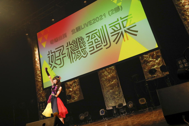 2部は<好機到来>というサブタイトルによる、寺嶋単独でのライブ。コロナ禍での活動を振り返るインタビュー映像が流れたあと、「#ゆーふらいとII」からスタートし、大人アイドルを体現した松井五郎作詞による「みんな迷子」や、「仮縫いのドレス」で魅了する。