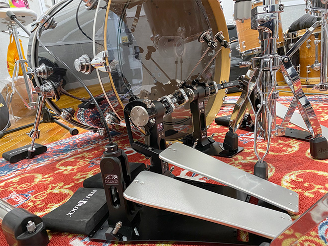 センターハットで左右にタムを振っていく感じ!僕も同じ方向のセッティングをしていた時があります。僕の場合はパーソンズの藤田勉大先生の影響でした。その時の藤田先生はBOZZIOismのチャイナ掲げる系ツーバス多点セットだったんですけど、リモートハットをセンターにおいて、ロートタムを左右に振ってました。真似したなぁ。ってか、DARWIN Pedalでしかもそのモデル。踏んでみたい。ってかいくらっすか?(楽器人チーフP イマイ)