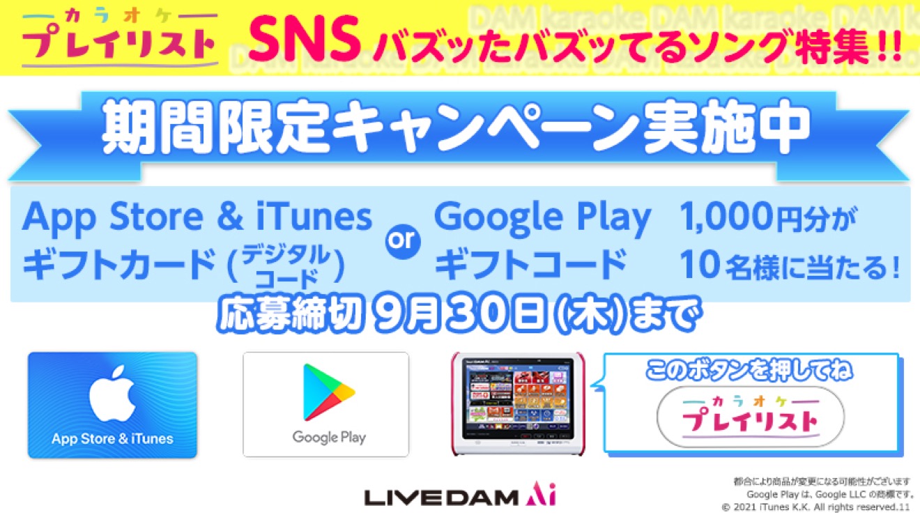 これらの課題曲を歌って応募すると、抽選で10名にGoogle Play ギフトコード(1,000円分)またはApp Store & iTunes ギフトカード(デジタルコード)(1,000円分)がプレゼントされる。ぜひ参加しながら楽しんでほしい。