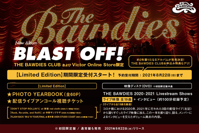 初回限定盤には、「THE BAWDIES 2020-2021 Livestream Shows」と題したDVDが付属。コロナ禍における過去3回の配信ライブ(@新宿 red cloth、@中野サンプラザ、@新木場 USEN STUDIO COAST)から選りすぐったライブ映像に加え、この1年を振り返り語るメンバーによるインタビューも収録される。また、THE BAWDIES CLUBとVictor Online Storeでは【Limited Edition】が発売される。初回限定盤にフォトイヤーブックと、3回の配信ライブのフル視聴チケットを付属した商品で、受注期間は8月22日(日)まで。