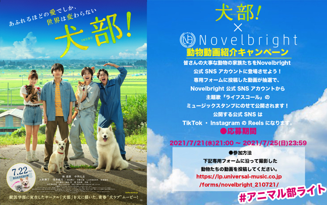 映画の公開と主題歌のリリースに先立ち、SNS上では7月21日より<映画「犬部!」× Novelbright 動物動画紹介キャンペーン>もスタートする。