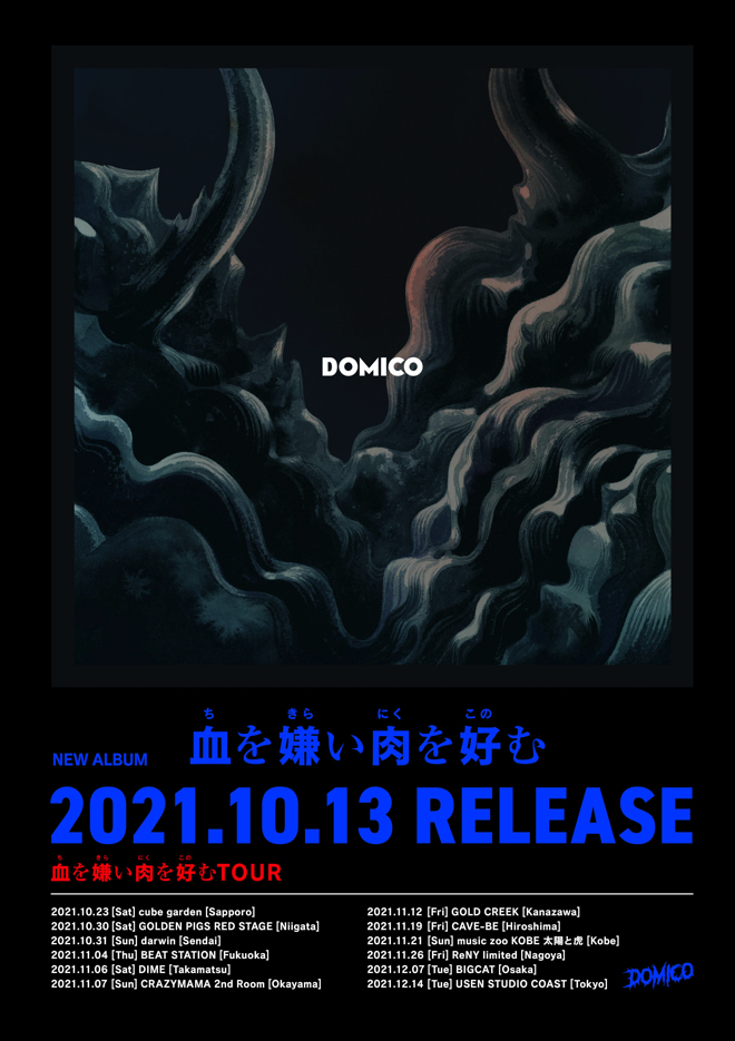 ドミコが、ニューアルバム『血を嫌い肉を好む』を10月13日にリリースすることを発表した。同作を引っさげたライブツアーの開催も決定している。