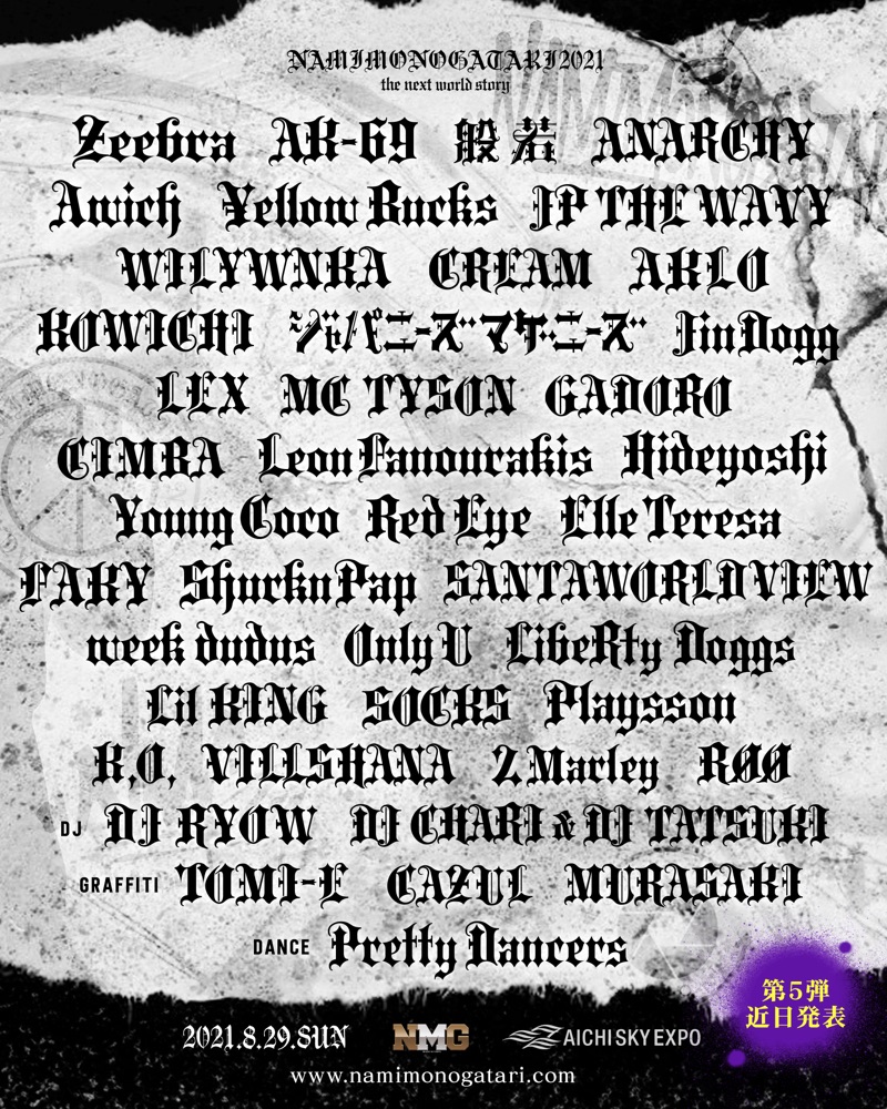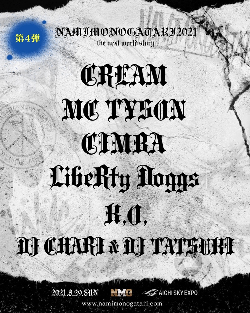 8月29日(日)に愛知県中部国際空港セントレア横に位置するAICHI SKY EXPO野外多目的広場で開催される<NAMIMONOGATARI>の第3弾アーティストとしてCREAM、MC TYSON、CIMBA、LibeRty Doggs、K.O.、DJ CHARI & DJ TATSUKIの出演が発表された。
