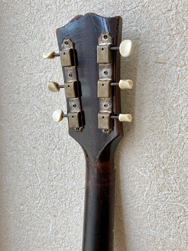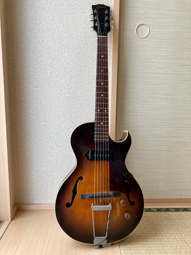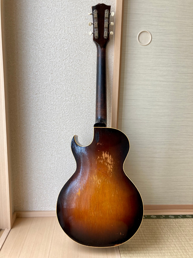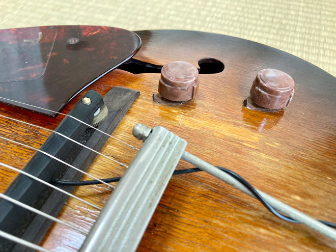 シリアルスタンプもラベルもない為、正確な年式は分かりませんが、テイルピースがイレギュラー品(オリジナルはもっと短いタイプ)、ノブもGibsonの古いラップスティールと同じタイプが付いている事から、ひょっとしたらプロトタイプ的な物かも?と購入したお店では言われました。