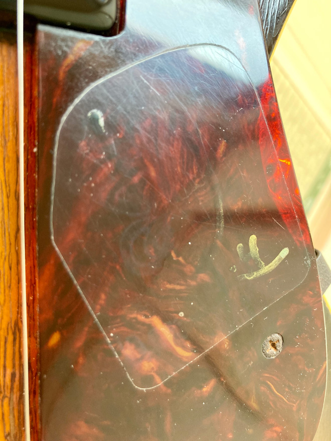 ピックガードの消えかかったサインは、偉大な音楽家、某細野さんから頂いたもの。10年前のあるイベント後に出待ちし、ド緊張しながらも少しお話をし、サインを頂きました。このギターは超ナローネックなので、風をあつめてetc、左手親指のフィンガリングが肝な某細野さんの曲を弾くのに、丁度良いんです。