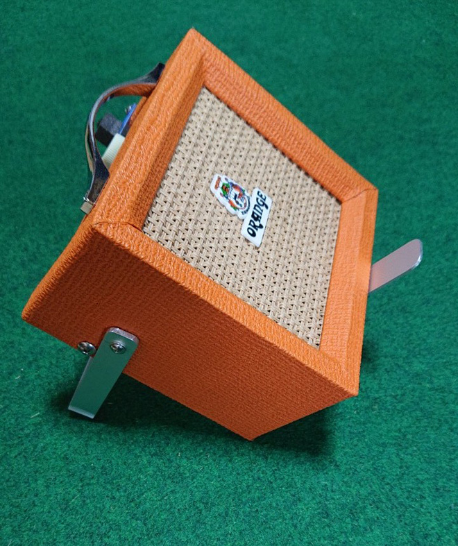 もちろん、お出かけの際には傾けアルミフレーム&起こしアルミプレートの双方はコンパクトに畳めるようにしています。(バッテリーは9V電池をスナップで使用)まったくの新参者アンプですがこれでホントにカワイイ相棒…となりました。