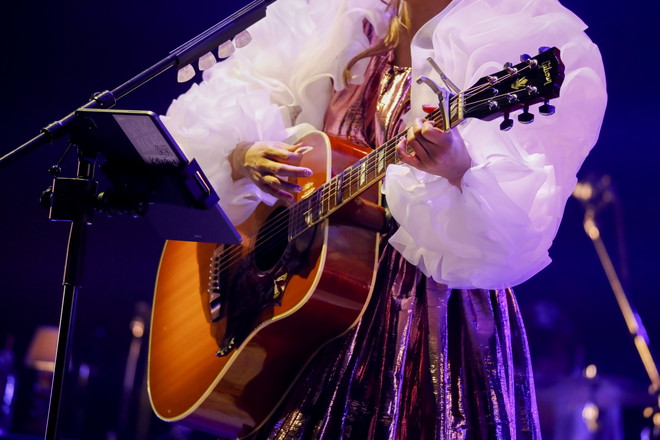 ライブは、様々な愛のかたちを歌ったニューアルバム『純愛クローゼット』のオープニングナンバーで、“愛と死”をテーマにした「あたしが死んでも」で幕を開けた。終わりを意識することで大切な人の日常がより愛おしくなるラブソングから、結婚を望みながらも一緒になれなかった失恋ソング「最後の彼女になりたかった」と、コレサワの代名詞であるアコースティックギターとチャーミングな歌声が優しく切なく響く楽曲を続けると、歓声を上げる代わりにペンライトを掲げた観客に向けて「ペンライトが綺麗すぎて泣きそうになった」と語り、「今日はツアーファイナルです。まったり、時には激しく聴いてもらえたらいいなと思います」と挨拶した。