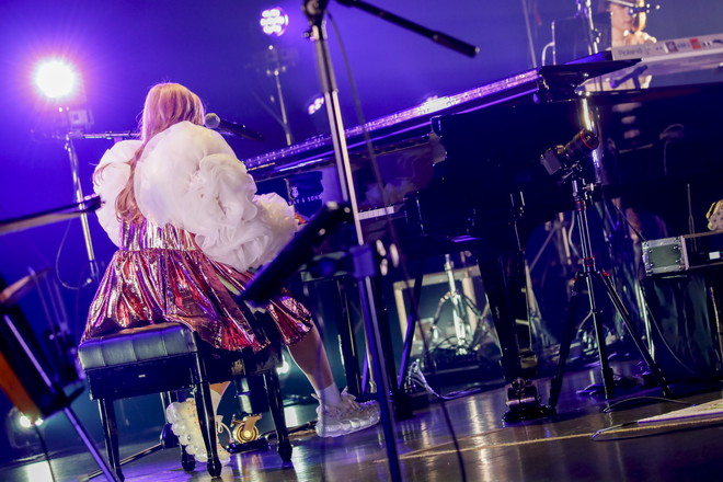 ロングのワンピースからボリューミーな白いフリルのアームカバーをまとい、シャイニーピンクのミニワンピへと着替えたコレサワは、恋人との日常を描いたブギーなシンセポップ「スーパーでデート」からハンドマイクでパフォーマンス。観客を軽やかなステップを踏みながらステージ上を所せましと歩き回った彼女は、ユニチャームとのコラボ楽曲「One Week」でラップのように弾むフロウを披露し、「Drama」では飛び跳ねながら歌い、総立ちになった客席の熱気を一気に引き上げた。