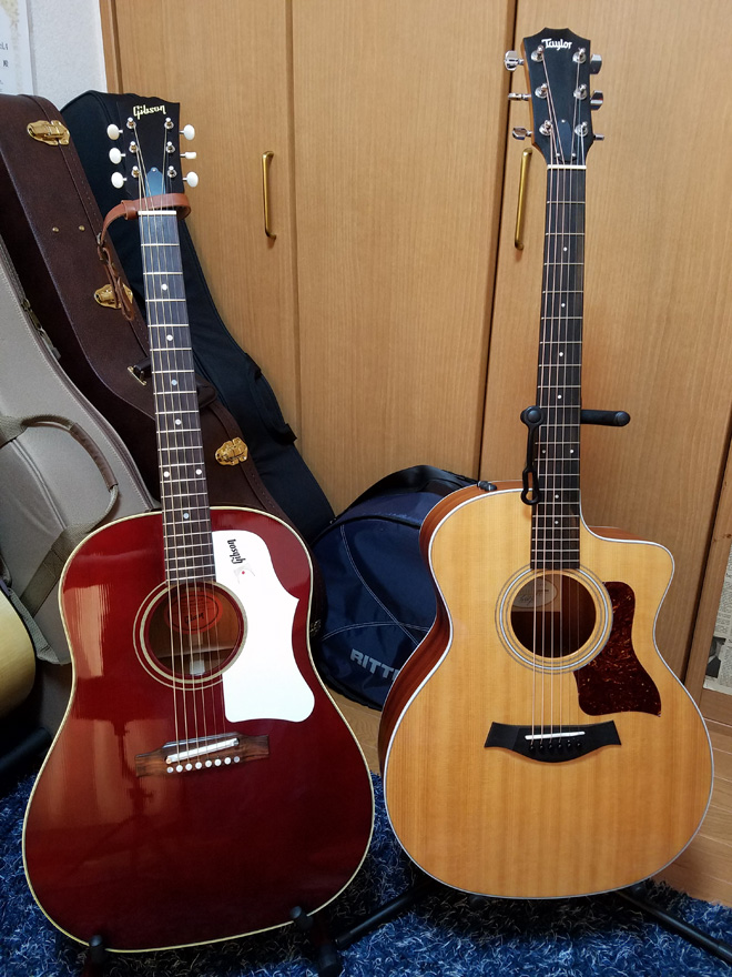 3年前にギターを始めるときに楽器店員さんの言われるがまま自社ブランドを購入。2年も過ぎると音の違いがわかってきて「他の音を弾いてみたい!」という欲望が芽生えました。おかげで長年のへそくりをこの2本につぎ込むことに。ギブソンは生アコ、アジャスタブルブリッジで暴れん坊。テイラーはエレアコ、koaの優しいお姉さんのようです。