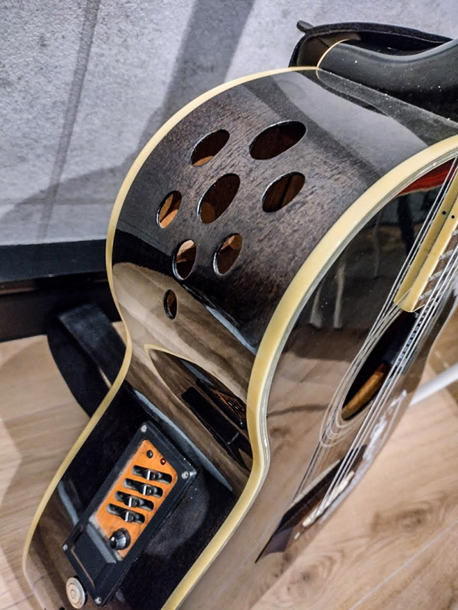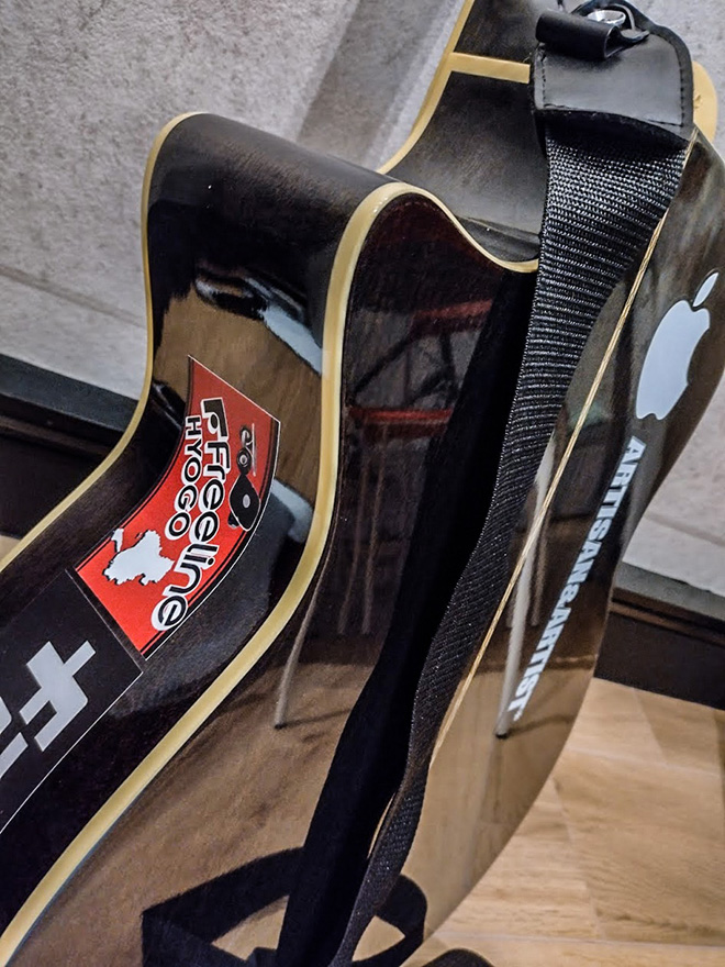 ステッカーからも愛着と愛情が伝わってきますね。確かにサイドにサウンドホールがあれば気持ちよさそう。サウンドホールが中央からずれていたり、オベーションのエポーレットようなリーフホール形状など、アコギの設計にはまだまだいろんな可能性が残されている気もします。1970年代には、サウンドホールとブリッジの間に小さな穴をあける珍改造が流行ったものです。あれ、どうだったんだろ…。(JMN統括編集長 烏丸)