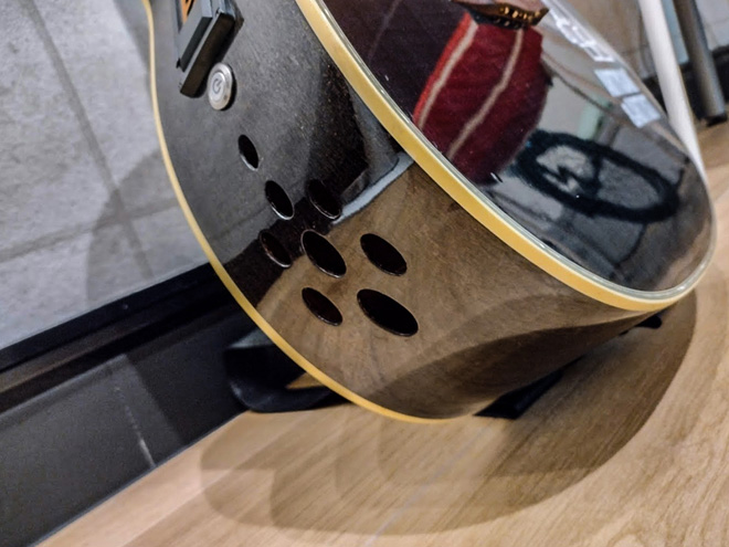 そして何より特徴的なのがボディサイドに穴が空!サイドサウンドホール?(すみません、ちゃんとした呼称は知りません)この穴のおかげで音量が大きく、ギターを構えたときに穴が上を向いているため、弾いていて自身の音の確認がしやすく無理に力んだピッキングをすることがなく演奏に強弱を付けやすいです。もちろんこの特殊な構造に一目惚れしてしまったのです。ちなみにボディの反対側(裏側)は、とくに普通の形状です。