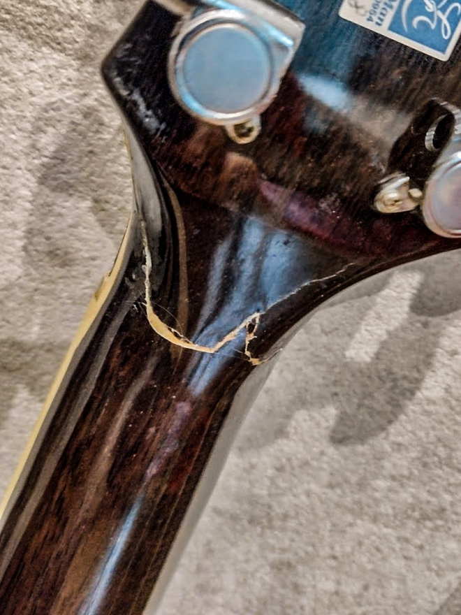 実は、屋外に持ち出したときに倒してしまい、ネックが折れてしまったのですが修理して今も愛用しております。素人修理でタイトボンドで接着しただけで見た目が悪くなってしまいましたが、修理から数年たっても演奏にまったく支障もなくこのまま使っています。