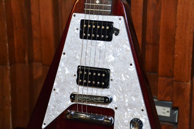 ユタニ:同じギブソンのフライングVでも年代によって色々違いがありますが、67年タイプにした一番の理由はピックガードですね。このデカいピックガードがついているのがカッコいいと思いました。あと、アームがついているモデルもありましたが、フライングVについているマエストロアームはあまり好きではないんです。マエストロアームとかビグスビーとか、レトロなルックスのアームは見た目がけっこう苦手ですね。