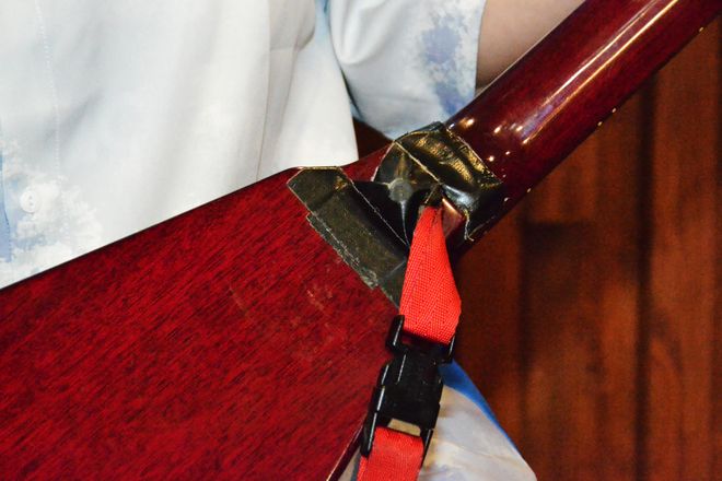 ユタニ:これは、ディマジオのClipLockのストラップを使っているからなんです。このストラップはもともと、高校の先輩が軽音楽部に置いていったもので、フライングVを買ったときから使っているんです。つけたり外したりも簡単だし、すごく使いやすくて好きなんですが、これを使うにはピンを替えないといけないんです。でもそれはイヤだったので、もともとのピンをそのまま使っているんですが、動いたときにねじれるので、専用のピンでないと抜けてしまうんです。ライブでもゆるむたびに締め直していたんですが、それも面倒なので、ねじれないように、動かないようにテープで固定しています。カッコよくはないですが、これだけでがっちり留まってます。