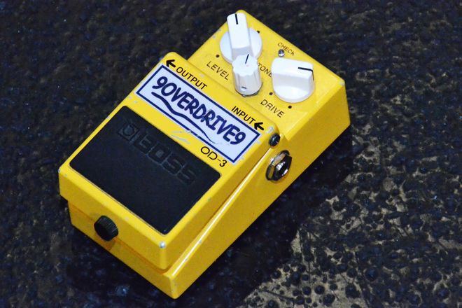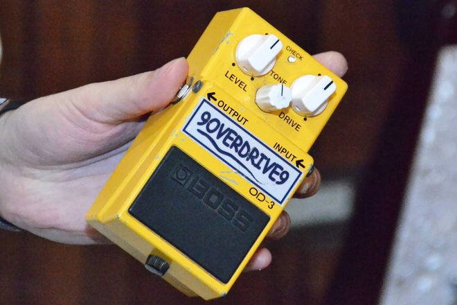 ユタニ:エフェクターはいつもはボードに組んでいて、レコーディングなどのときにはバラして組み替えたりしていますが、どんなときもこの2つは絶対に外さない、という2個を今日は持ってきました。まず、オーバードライブはBOSS OD-3 Mod.というモデル。もとはBOSSのOD-3ですが、9OVERDRIVE9というメーカーが改造を施したものです。ヴォーカルのヨシダタクミがメーカーさんからこのモディファイモデルを送ってもらって、使ってみたらすごくよかったので、僕も使うことにしました。