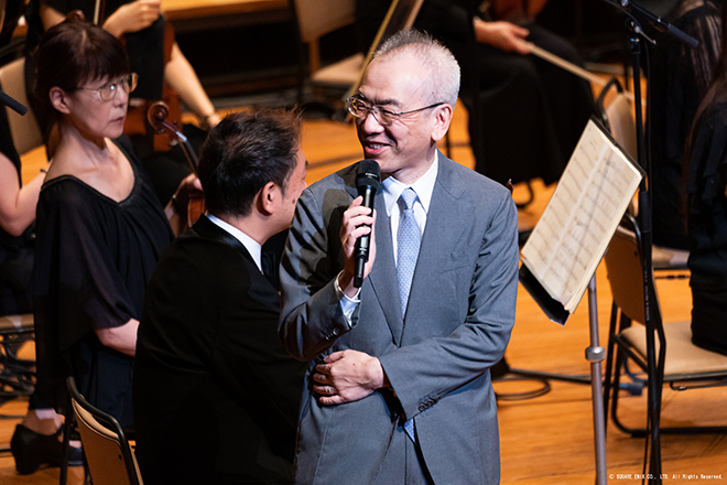 本編も残すところあと一曲となったところで、この日最大のサプライズがやってきた。司会進行の市川が、とある方からビデオメッセージが届いていると紹介すると、映像がスタート。そこに映っていたのは、シンガーソングライターの山崎まさよしだった。この日は残念ながらスケジュールが合わず、現場に駆けつけることが難しいのだが、映像で演奏に参加することを告げると、彼が歌う『ロマンシング サガ -ミンストレルソング-』のテーマ曲に、この日のためのスペシャルアレンジが施された「メヌエット -オーケストラアレンジ Ver.-」が披露された。原曲は、哀愁溢れるアコーディオンの音色が悠久の旅を想起させるものになっていたが、オーケストラの演奏によって、繊細かつ力強いものに生まれ変わっていた。詩人の服装をした山崎の歌声も熱を帯びていき、驚きと興奮に包まれたまま、本編の幕が降りた。