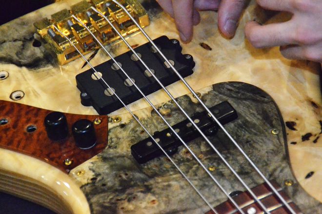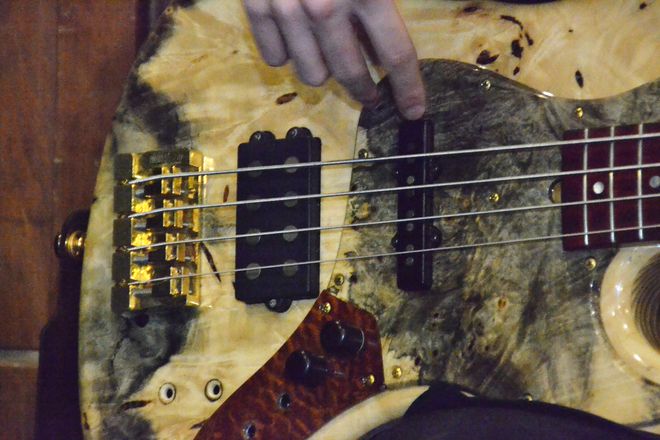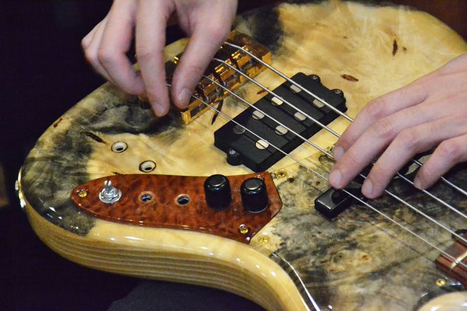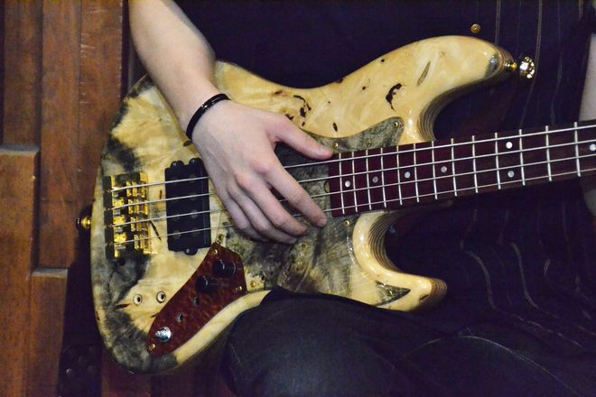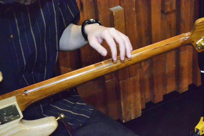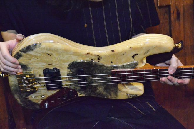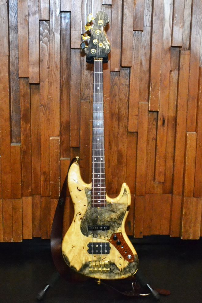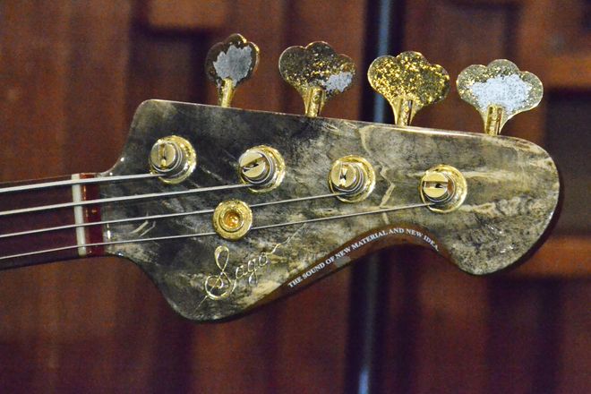 ヤマザキヨシミツ(以下、ヤマザキ):これはSago New Material Guitarsさんのベースです。Sagoさんのサイトで、こんな木を使ってベースを作ることができる、というのを見て、それがとてもカッコいいと思ったのでオーダーで作ってもらいました。試奏もしないで、ホントに木の見た目だけで(笑)。