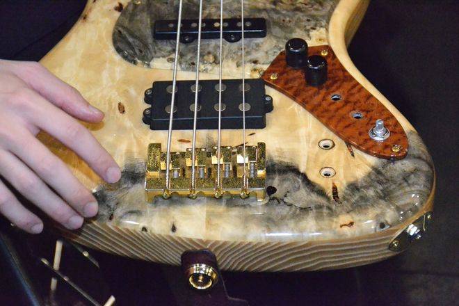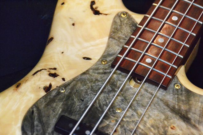 ヤマザキ:そうです。これをトップに貼るとこういう感じになる、というサンプルを見て。まず、ジャズベースタイプのボディにこういう木を貼って、というのを決めて、それからピックアップなどを選んでオーダーしました。見た目はだいたいこんな感じになるんだろうなと予想はしていたんですが、実際に出来上がってきて実物を見たら想像以上にカッコよくて、すごくテンションが上がりました(笑)。