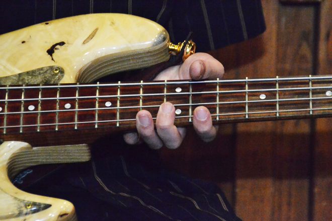 ヤマザキ:パンチが出るようになったのがまず一番ですね。以前はなんとなくフワッとしていて、ハイミドルだけが抜けてくるというか、ミッドにドスが利いていない感じだったんです。でもピックアップをシリーズ接続にしたことで、音程感がグッと出てきたし、締まった感じになりました。トーンをつけてもらったのも良かったと思います。このトーン、埋もれないでギュッと凝縮してくれるような音になるタイプなので、すごく使いやすいです。以前は低域も高域もけっこう出ていて音域が広かったんですが、今は締まった音になってくれました。コンプレッサーをかけたみたいなイメージの音。今考えると、もともとアクティブの音は好きではなかったんだな、と思います。音のコントロールがしやすくて楽かな、と思ったんですが、アクティブにする必要はなかったかも(笑)。