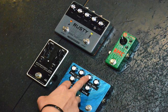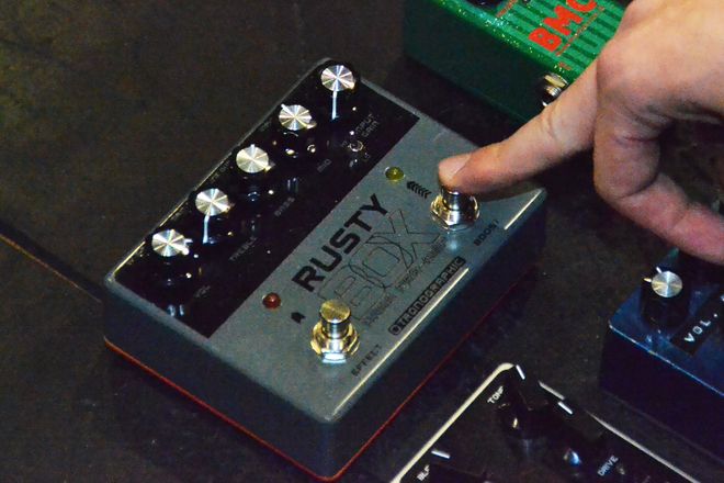 ヤマザキ:TronographicのRusty Boxです。ハイゲインのトランジスタアンプのようなサウンドを作れるプリアンプですが、僕はおもにダークグラスで削られた低域を補正するために使っています。歪みも少しこれで足していますね。まだ導入したばかりで色々試しているところですが、これだけでもプリアンプとして基本的な音を作れるし、歪みも作れるので、ひょっとするとそのうちエフェクターはこれ一つになるかもしれません。出力もメインとラインアウトの2つを装備しているので、ライブもレコーディングもこれだけでやれそうだな、と思っています。