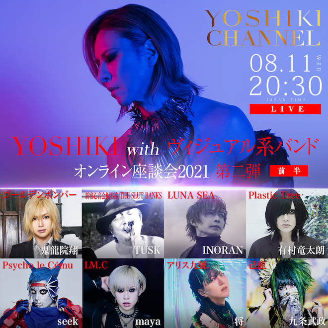 また、20時半からの「V系バンド オンライン座談会2021 第二弾」は、鬼龍院翔(ゴールデンボンバー ※前半・無料放送のみの出演)、 TUSK(新宿心音会板谷祐 / THE SLUT BANKS)、 INORAN(LUNA SEA)、 GEORGE(LADIESROOM ※後半のみの出演)、 有村竜太朗(Plastic Tree)、 seek(Psycho le Cému)、 maya(LM.C)、 将(アリス九號.)、 九条武政(己龍)と、 ヴィジュアル系シーンで活躍するアーティイストが出演し、LAにいるYOSHIKIとオンラインでトークを繰り広げる。