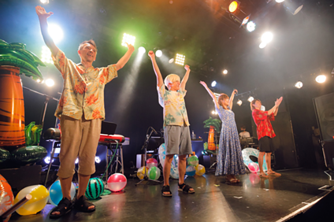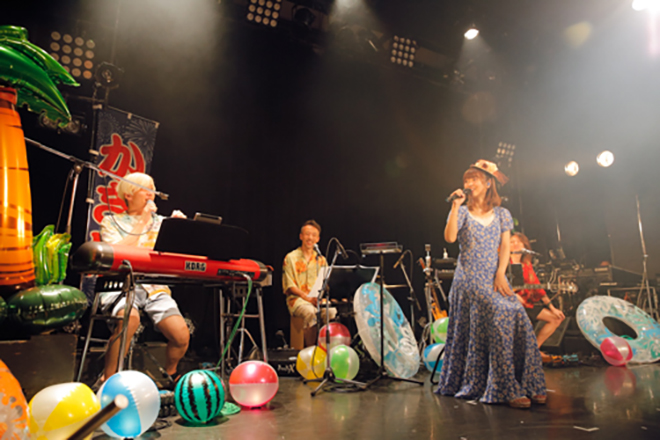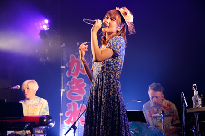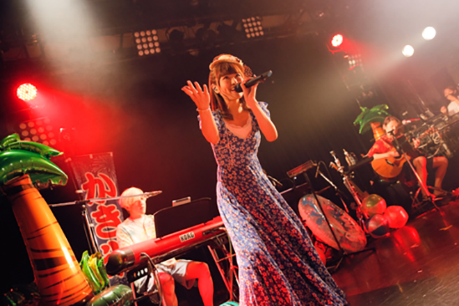 浮き輪やビーチボール、「かき氷」ののぼり旗で夏らしく彩られたステージに、まずはアロハシャツ姿のバンドメンバーがスタンバイ。そしてオープニング演奏から「Love Summer」へと繋ぎ、ワンピースに麦わらのミニハットを合わせた渕上が、イントロを歌いながら登場した。夏を感じる選曲で明るくスタートし、さっそく海へと遊びに来たような高揚感に包まれる。