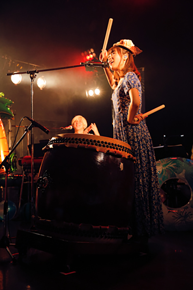 嬉しいお知らせのあとは、「次の曲は私が叩くリズムで盛り上がっていきましょう!」という渕上の合図で、なんとステージに和太鼓が登場。渕上本人が和太鼓を叩きながらリズムをレクチャーし、そのリズムに合わせて、「フラミンゴディスコ」ならぬ「フラミンゴ音頭」を会場が一体となって楽しんだ。大胆なアレンジだが、思いのほか和太鼓のリズムがマッチしており、これはぜひもっと大きな会場で、もっと大勢で一緒に盛り上がりたいところだ。8曲目には、第1弾でもセットリストにあった「Fly High Myway!」を披露。ジャズ調のおしゃれなアレンジが好評だったが、今回はそこに客席のクラップも加わり、さらに魅力の増したサウンドが届けられた。