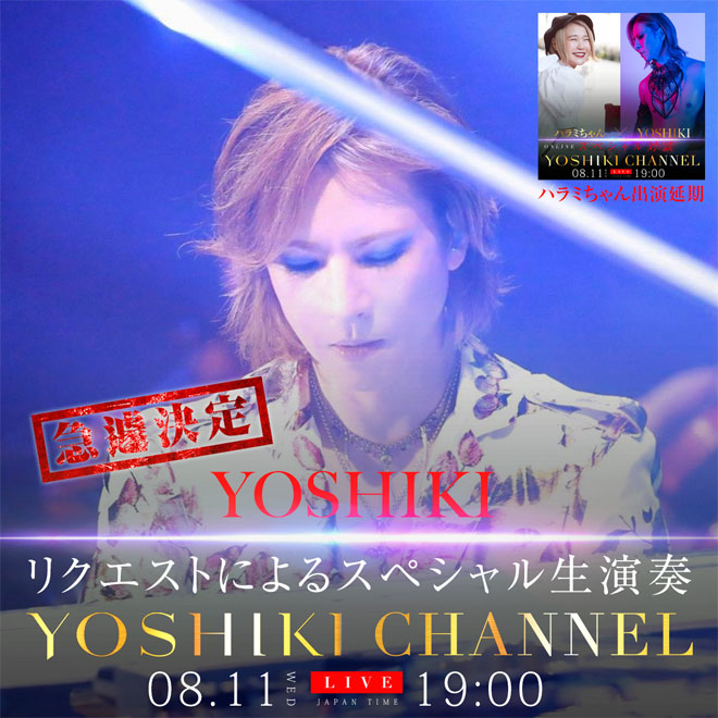 19時からの『YOSHIKI CHANNEL』では、X JAPANなどYOSHIKIが作曲した楽曲のリクエストをファンから募りハラミちゃんが生演奏する予定だったが、出演延期に伴い急遽YOSHIKI本人がリクエスト曲を生演奏することに。生放送中に視聴者から聴きたい楽曲を募集し、YOSHIKIがLAからピアノ演奏を行なう。