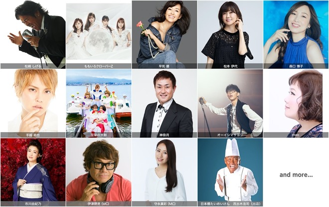 松崎しげる / ももいろクローバーZ / 早見 優 / 松本伊代 / 森口博子 / 手越祐也 / 豆柴の大群 / 神奈月 / オーイシマサヨシ / mao / 市川由紀乃 and more