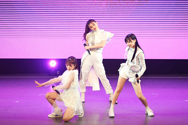 ライブのオープニングでは、楽屋で円陣を組み気合を入れる3人の掛け声と共に、オーディション当時の映像や、この日に向けて積み重ねてきたレッスン、リハーサル風景などが映し出される。歌唱時の表情、ダンスのキレなど、着実に今日という日のために磨き上げられてきた3人の軌跡を感じられるオープニングムービーでステージは幕を開けた。