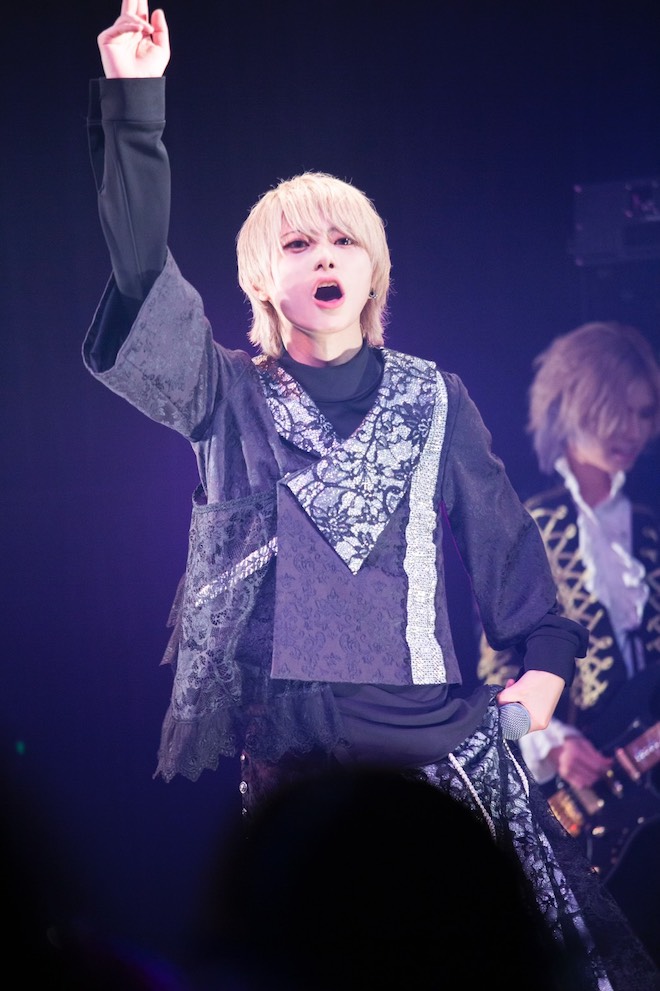 しかし、会場が熱してきたのも束の間、メンバー5人は自己紹介を挟み、軽く挨拶をすると、そのままさらりとステージ袖へ捌けてしまった。暫くして和テイストのSEが鳴ると、新衣装にチェンジしたメンバーが再びステージへ登場。コール&レスポンスで会場を煽り、そのままの勢いで新曲「無常論」を届けた。斬新な曲調、ガラッと雰囲気の変わった和風の衣装が、また一つ双極の表現の幅を広げている。