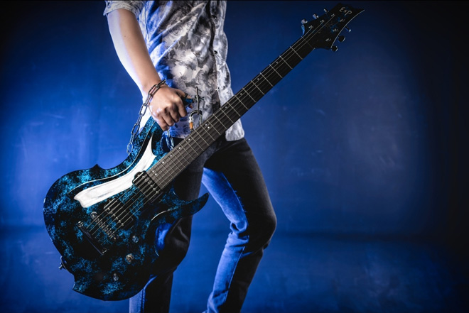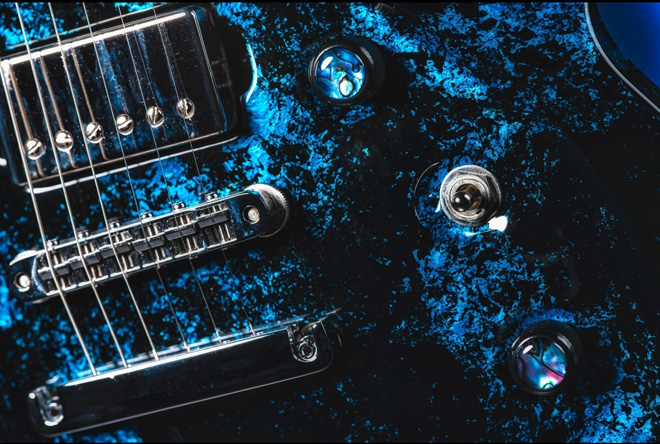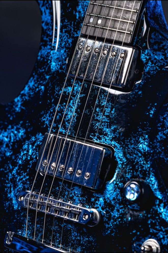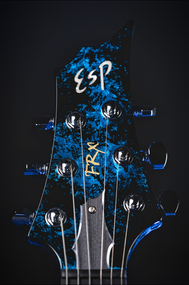 ESPのFRXを元にリキッドメタルブルーとブラックを層を変えて塗装していただいたものになります。光を当てると下のリキッドメタル塗装が浮かび上がってくる仕様になって非常に綺麗なギターです。