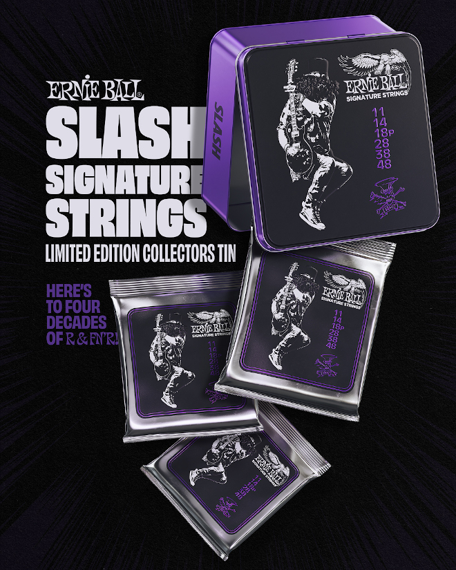 ERNIE BALLが、Slashのグラフィックをパックとボックスに配したギター弦のセット「SLASH SIGNATURE STRING SET」を8月25日より発売する。