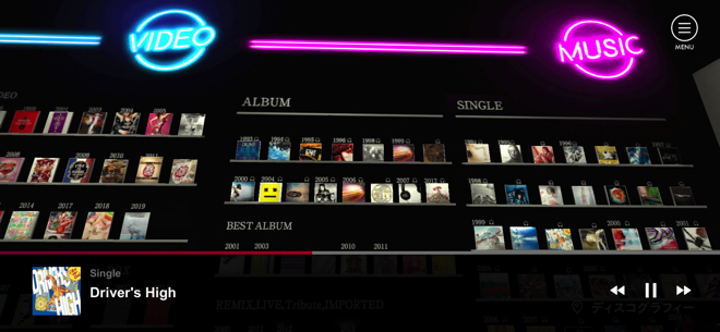 過去に発表したCD、DVDのジャケットを展示したエリア。CDのシングルとアルバムはクリックすると試聴することが可能。