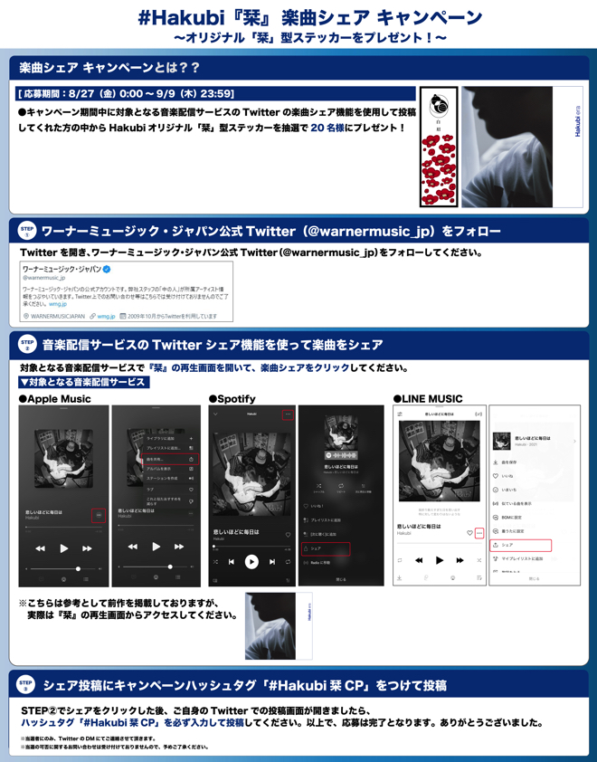 ワーナーミュージック・ジャパンの公式Twitterをフォローし、ハッシュタグ「#Hakubi栞CP」を付けてApple Music / Spotify / LINE MUSICのいずれかから「栞」をシェアした方の中から抽選で20名様にHakubiオリジナル「栞」型ステッカーをプレゼント。